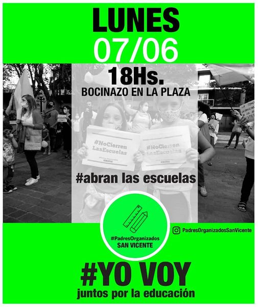 Será este lunes 7 de junio, a las 18 hs, dónde dicho grupo realizará un bocinazo en la plaza bajo el lema #AbranLasEscuelas.