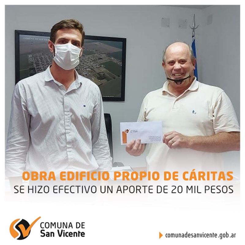 En la mañana de este martes 23 de febrero, el Presidente Comunal, Gonzalo Aira, hizo efectivo un aporte enviado por el Diputado Provincial Juan Cruz Cándido, para la obra de construcción del edificio propio de Cáritas.