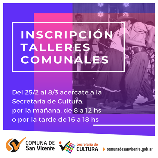 La Secretaría de Cultura comunica que, a partir del jueves 25 de febrero, hasta el lunes 8 de marzo, se encuentra abierta la inscripción para los diferentes Talleres Comunales correspondientes al período lectivo 2021.