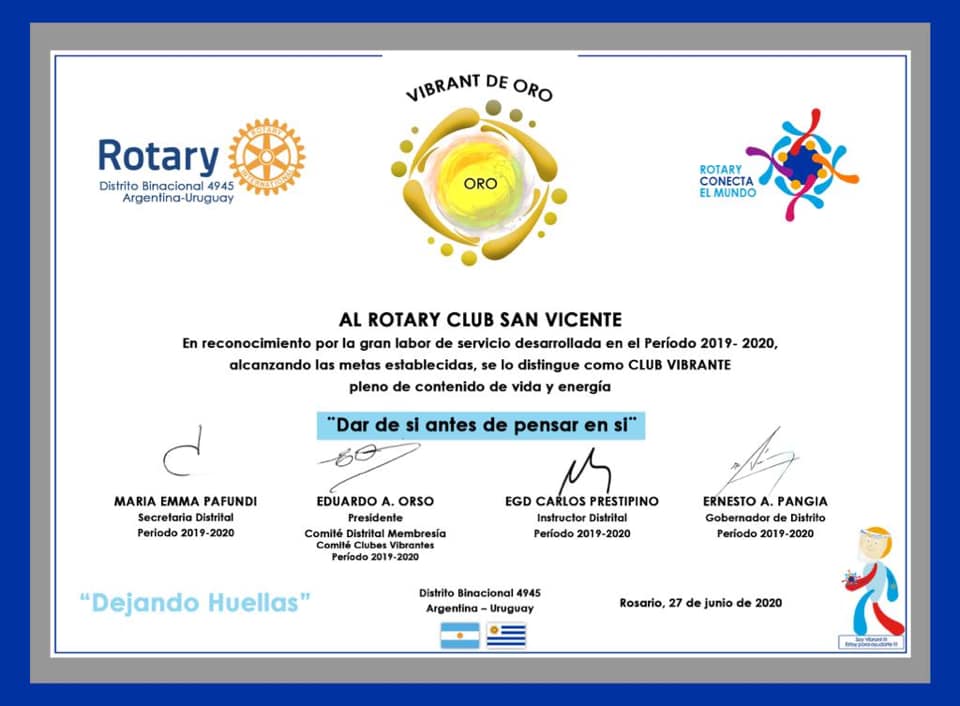 El Gobernador del Distrito les entregó una distinción al Rotary Club San Vicente.