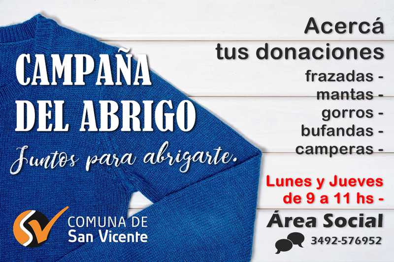 Juntos podemos ayudar a pasar un invierno más cálido a aquellos que lo necesitan, por eso acercá tus donaciones al Área Social. Mantas, frazadas, gorros, bufandas y camperas, en buenas condiciones.
