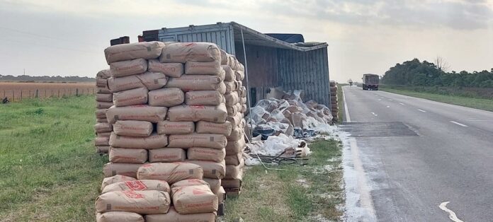 En la tarde de este martes 29 de marzo, en Ruta 66 a unos 7 kilómetros de Carlos Pellegrini en dirección a Cañada Rosquín, un camión se accidentó y volcó su acoplado cargado con bolsas de harina.