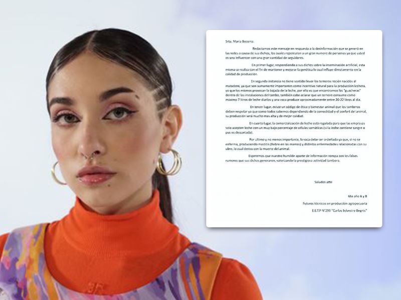 La cantante e influencer había criticado a la industria lechera y los estudiantes le enviaron una carta advirtiendo que sus dichos generan "desinformación".