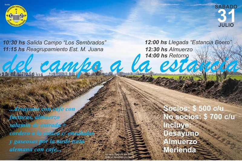Con autos de época y por los caminos rurales de la zona. Organizado por "Escudería Santafesina" y se realizará este sábado 31 de julio. El lugar de partida será desde el Paraje Los Sembrados a las 10:30 horas.