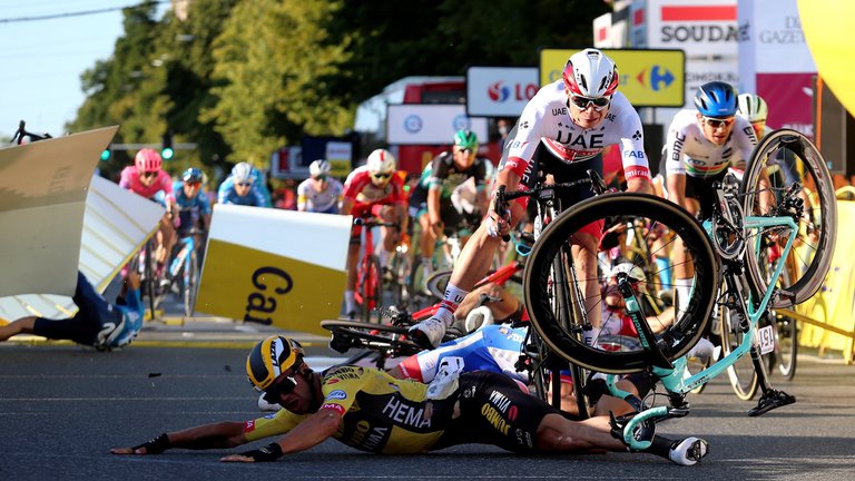 Fabio Jakobsen, declarado ganador de la carrera, fue encerrado por un rival contra las vallas de seguridad y tuvo que ser trasladado en ambulancia. Hay varios heridos