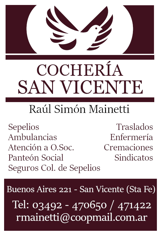 Con motivo de la emergencia sanitaria que es de público conocimiento, se limitará el ingreso de hasta un máximo de 10 personas (que podrán rotar). Servicio Cocheria San Vicente de Raul Simon Mainetti